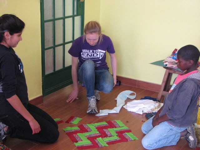 Day 4: Today we worked on the small staircase quilts to show the women what they could make with just a few strips of fabric. The younger kids made some more dolls, which they love to play with and throw around. The older kids and women worked on their applique and they made simple houses. Many of them turned out very well and we are planning on taking them back to America in a quilt. Once the older women had finished their applique they were very excited to make small quilts. They had a lot of fun picking out fabrics and they made some very beautiful work.